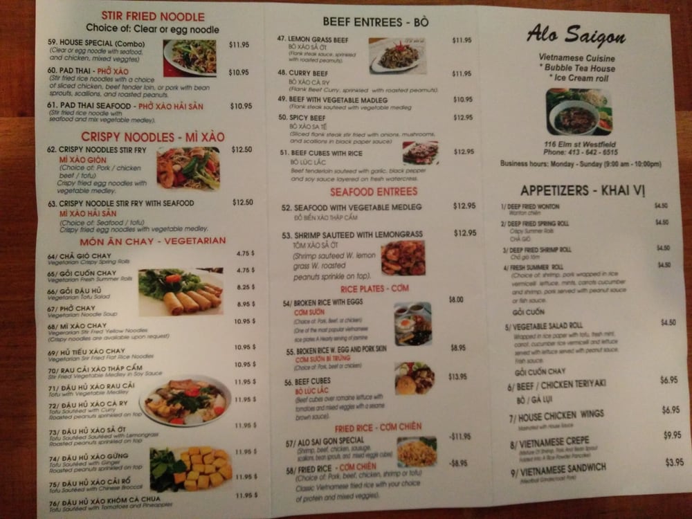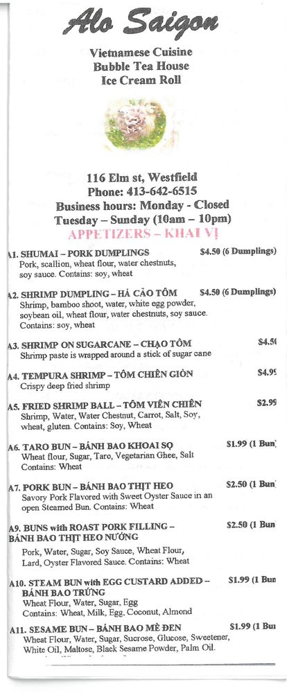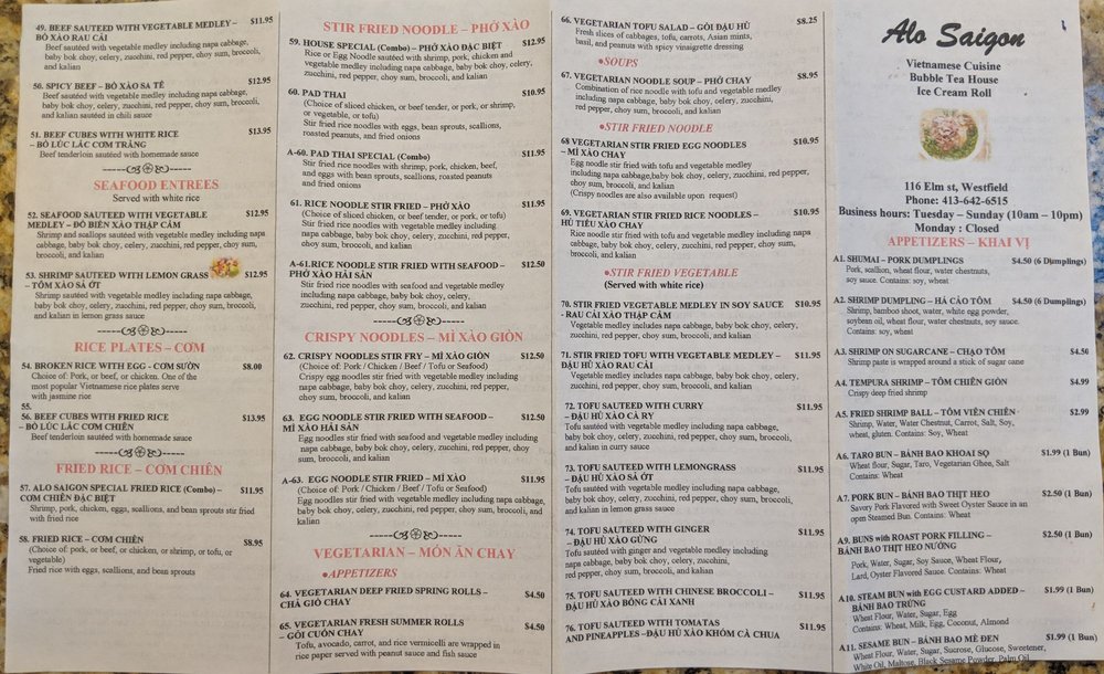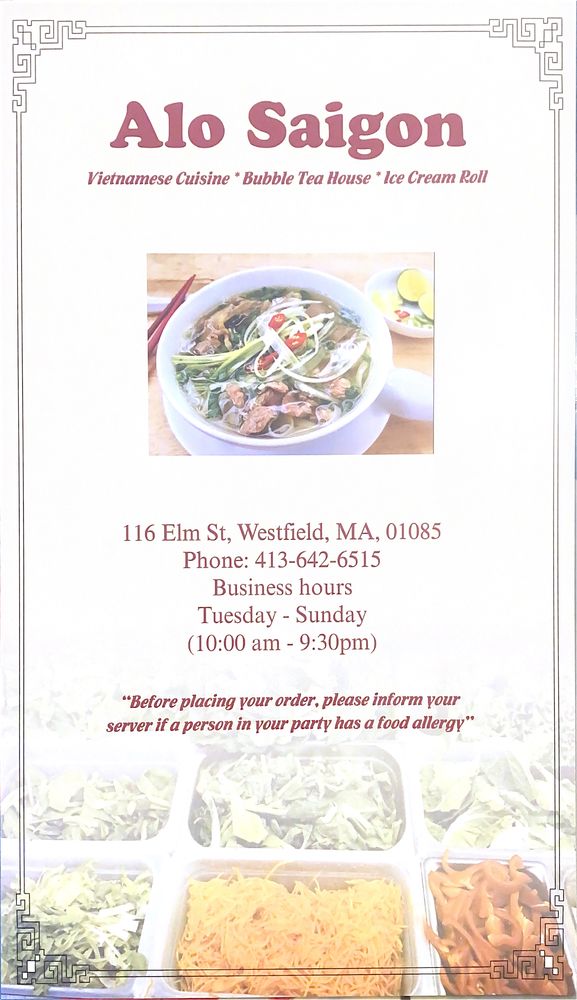 "Alo Saigon" is a Vietnamese restaurant located in Westfield, MA that offers a variety of options for its customers. With their takeout, delivery, and vegan options, this restaurant caters to a wide range of dietary preferences. Their menu includes dishes such as 3 meat Vermicelli meals, pork bao buns, dumplings, chicken pho, and beef brisket pho, all of which have received high praise from customers. The flavorful broth, tender meats, and generous portions make it a standout among other restaurants in the area. Customers have noted the quick service and delicious food, with some mentioning the friendly and attentive staff. Overall, "Alo Saigon" is a must-visit for those craving authentic Vietnamese cuisine in a welcoming atmosphere.